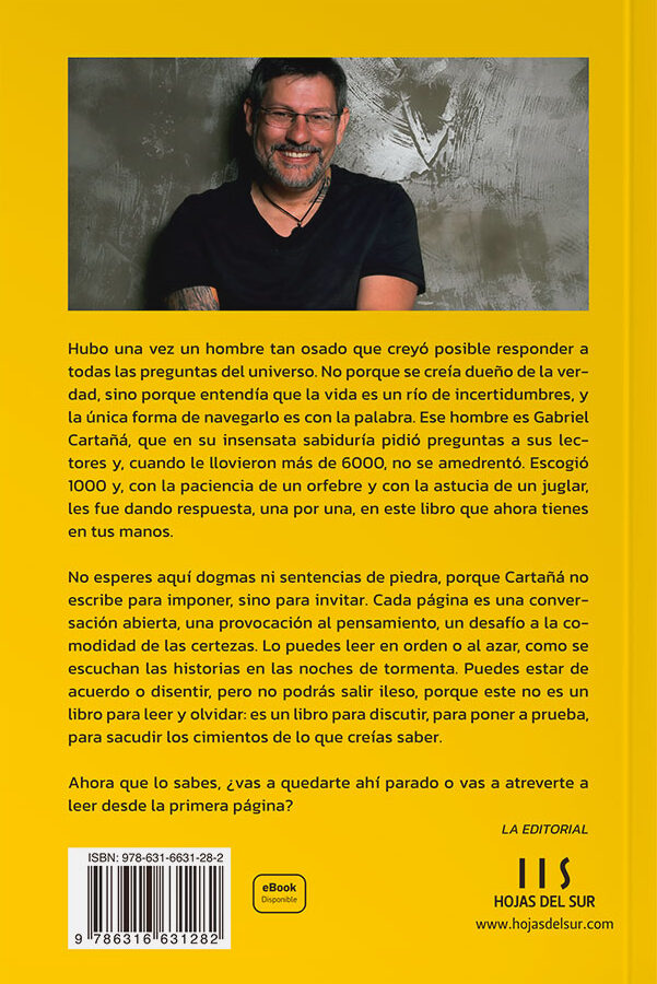 Hubo una vez un hombre tan osado que creyó posible responder a todas las preguntas del universo. No porque se creía dueño de la ver­dad, sino porque entendía que la vida es un río de incertidumbres, y la única forma de navegarlo es con la palabra. Ese hombre es Gabriel Cartañá, que en su insensata sabiduría pidió preguntas a sus lec­tores y, cuando le llovieron más de 6000, no se amedrentó. Escogió 1000 y, con la paciencia de un orfebre y con la astucia de un juglar, les fue dando respuesta, una por una, en este libro que ahora tienes en tus manos.