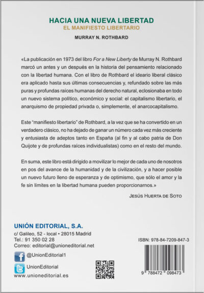 Todo amante de la libertad, comprometido con una vida digna, se debe a sí mismo la lectura de esta maravillosa obra. Fredy Kofman «La publicación en 1973 del libro For a New Liberty de Murray N. Rothbard marcó un antes y un después en la historia del pensamiento relacionado con la libertad humana. Con el libro de Rothbard el ideario liberal clásico era aplicado hasta sus últimas consecuencias y, refundado sobre las más puras y profundas raíces humanas del derecho natural, eclosionaba en todo un nuevo sistema político, económico y social: el capitalismo libertario, el anarquismo de propiedad privada o, simplemente, el anarcocapitalismo. Este «manifiesto libertario» de Rothbard, a la vez que se ha convertido en un verdadero clásico, no ha dejado de ganar un número cada vez más creciente y entusiasta de adeptos tanto en España al fin y al cabo patria de Don Quijote y de profundas raíces individualistas como en el resto del mundo. En suma, este libro está dirigido a movilizar lo mejor de cada uno de nosotros en pos del avance de la humanidad y de la civilización, y a hacer posible un nuevo futuro lleno de esperanza y de optimismo, que sólo el amor y la fe sin límites en la libertad humana pueden proporcionarnos.