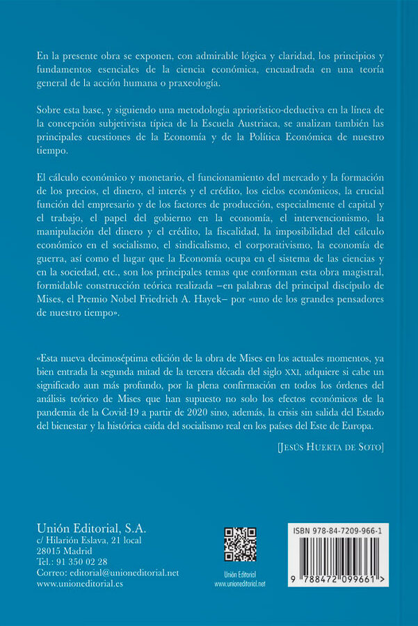 En la presente obra se exponen, con admirable lógica y claridad, los principios y fundamentos esenciales de la ciencia económica, encuadrada en una teoría general de la acción humana o praxeología.